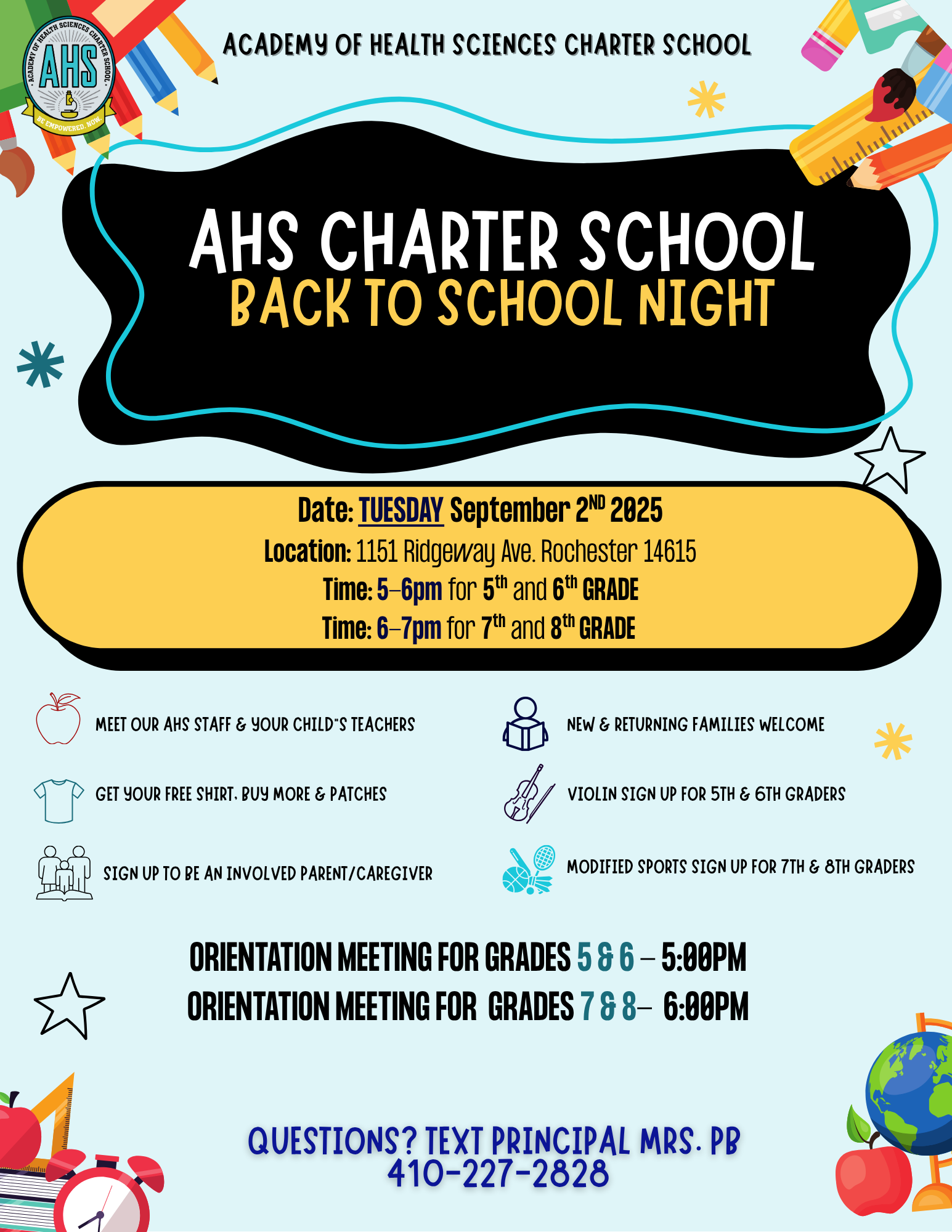 Please join us for our Back to School Night on Monday, September 2nd from 5:00 pm –7:00 pm at the Academy of Health Sciences Charter School Campus.
